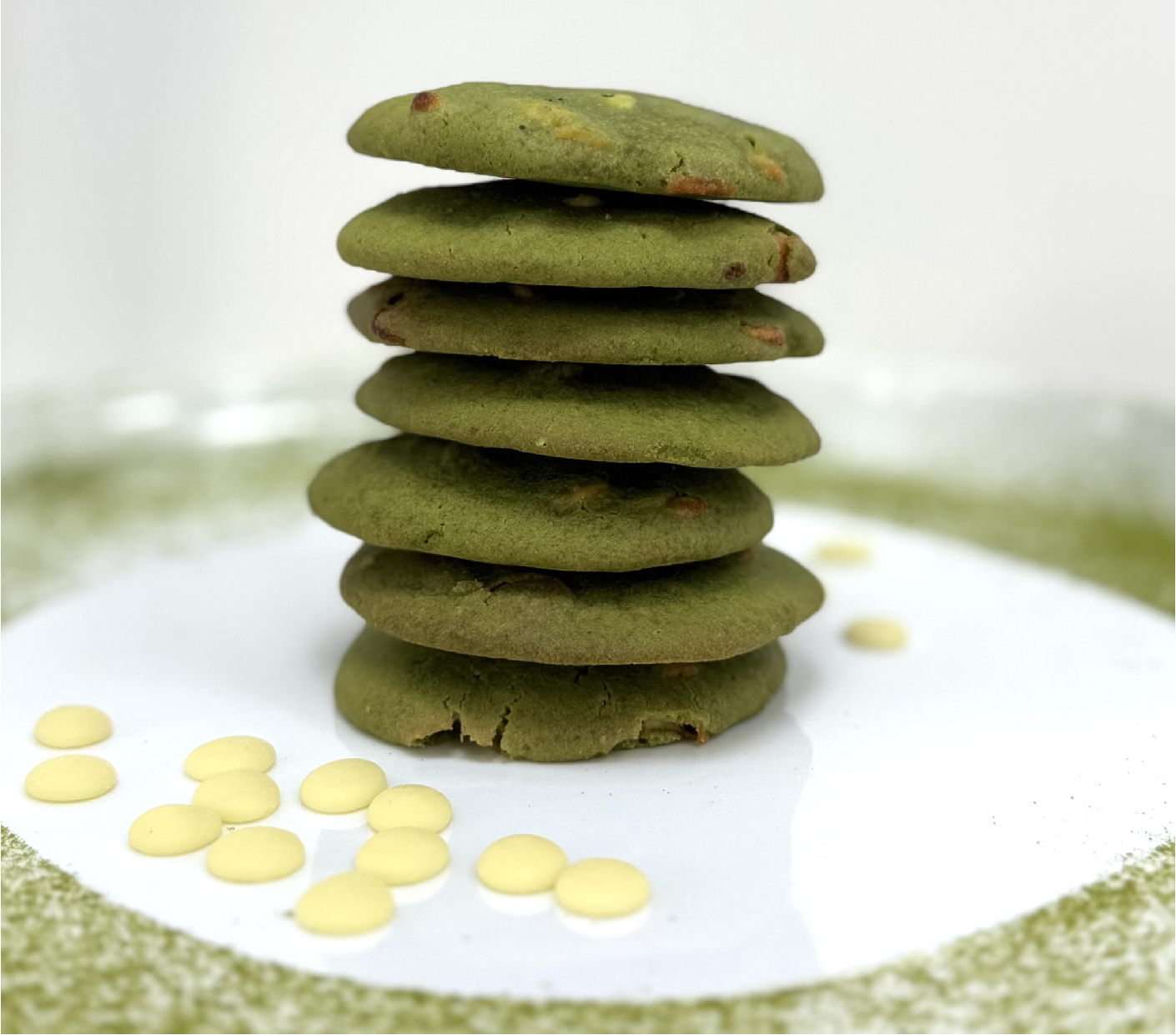 الكوكيز بالماتشا الخالية من الجلوتين مصنوعة من مزيج ناعم من طحين الأرز الأبيض، طحين الأرز البني، نشا البطاطا وطحين التابيوكا لتقدّم قواماً طرياً يذوب في الفم.